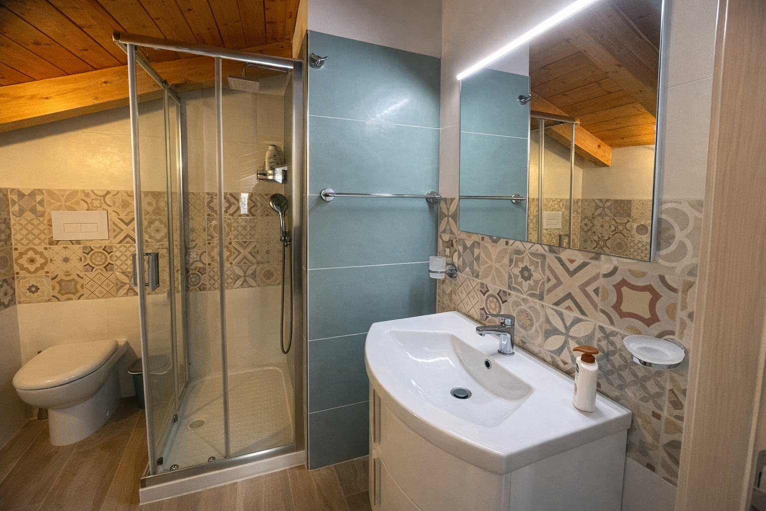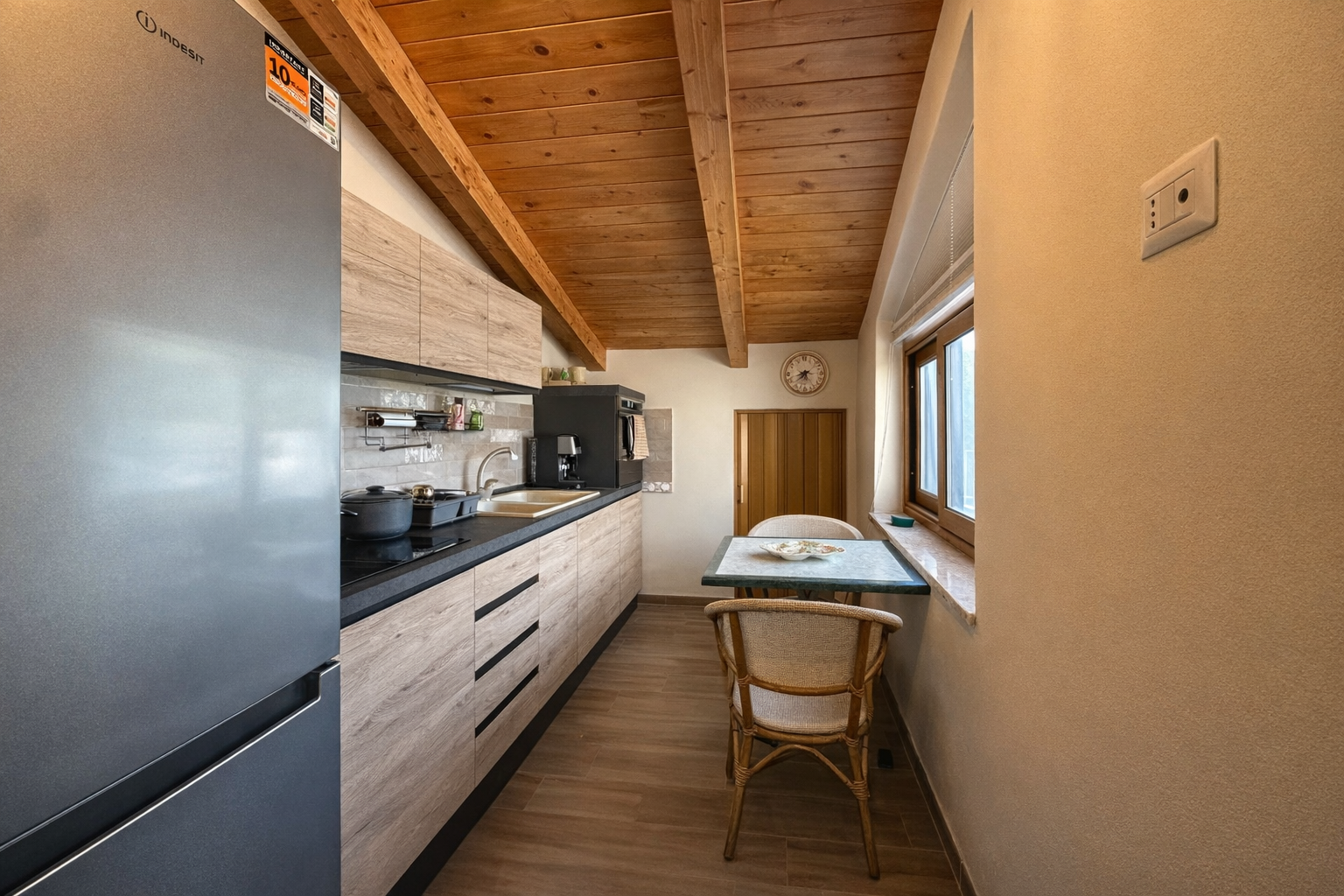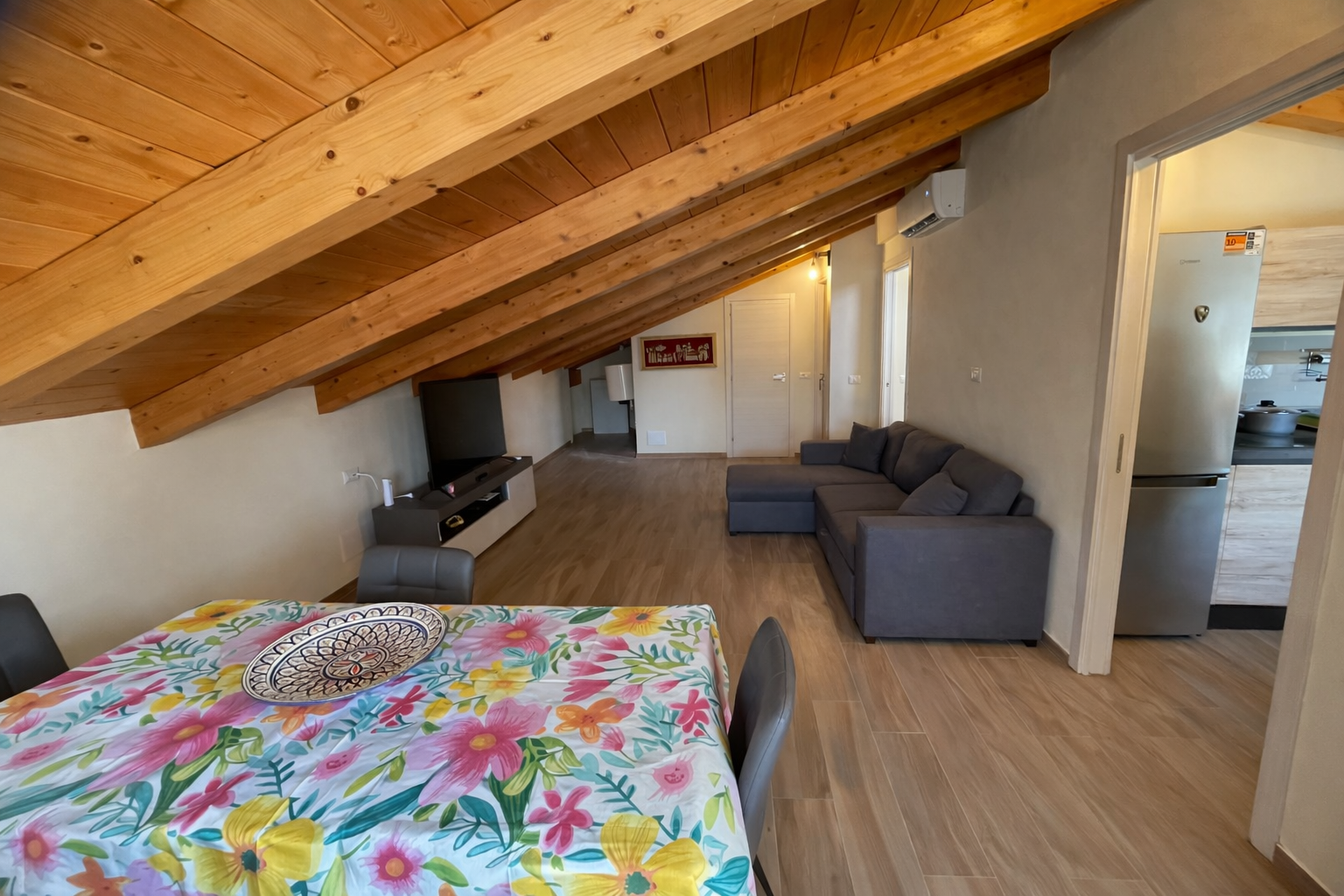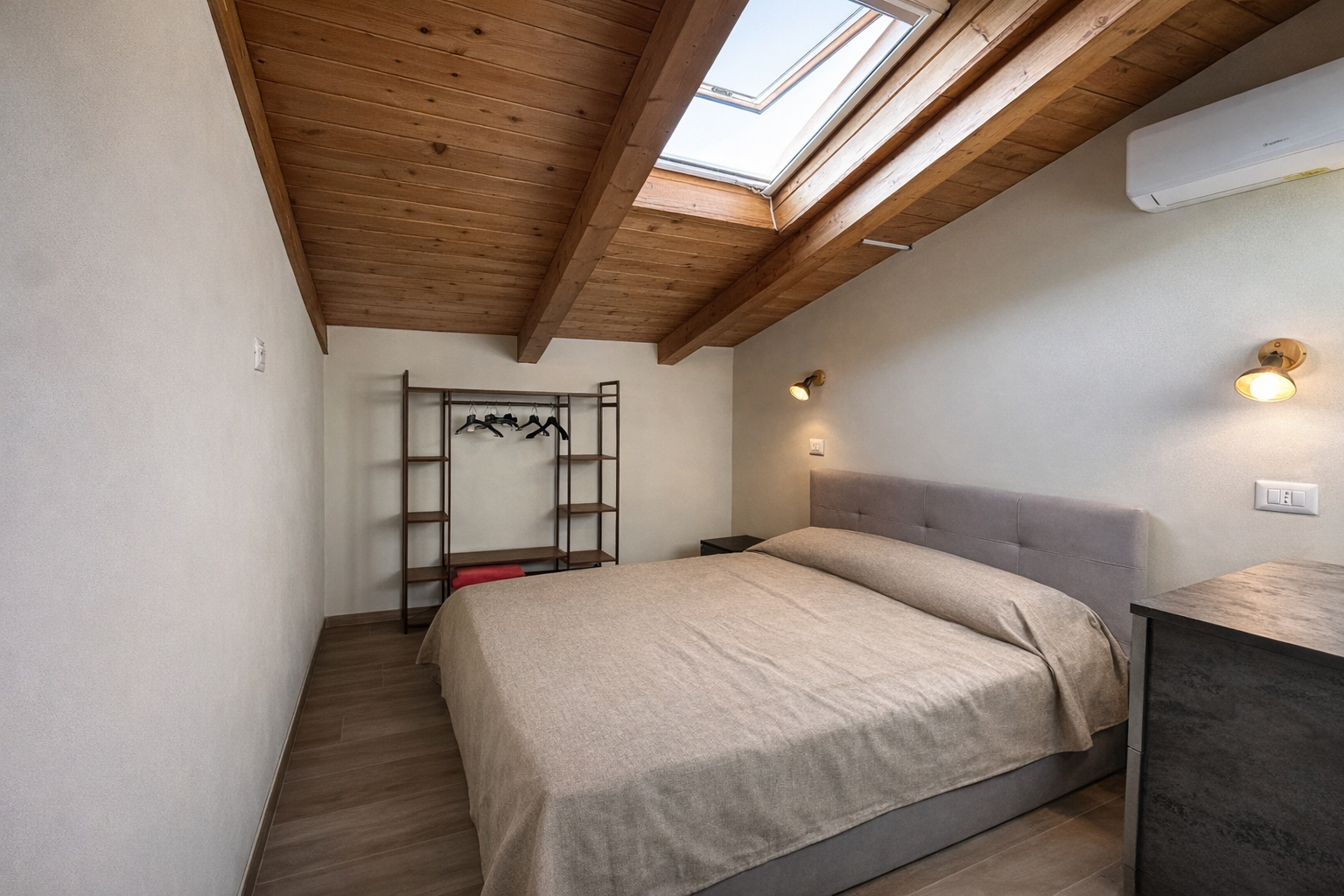 L’appartamento si distingue per i suoi ambienti luminosi e curati, impreziositi da soffitti mansardati in legno con travi a vista, che donano calore ed eleganza agli spazi. La luce naturale, valorizzata dai lucernari, contribuisce a creare un’atmosfera rilassante e accogliente in ogni ambiente.