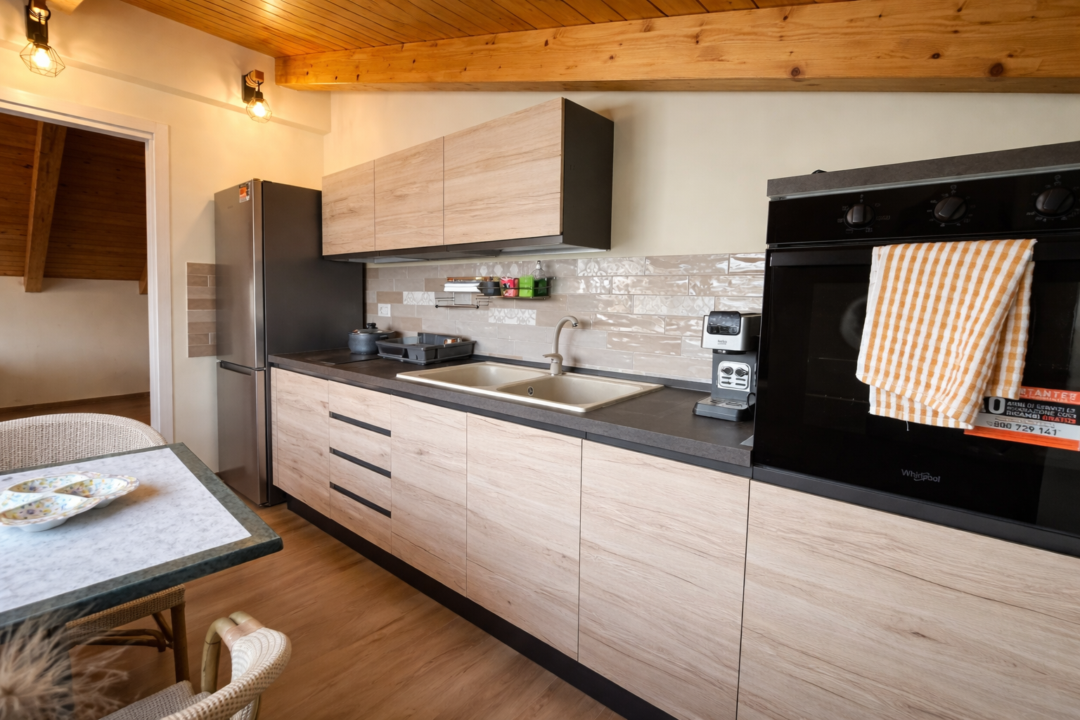 Cucina attrezzata con frigorifero, forno e macchina da caffè automatica