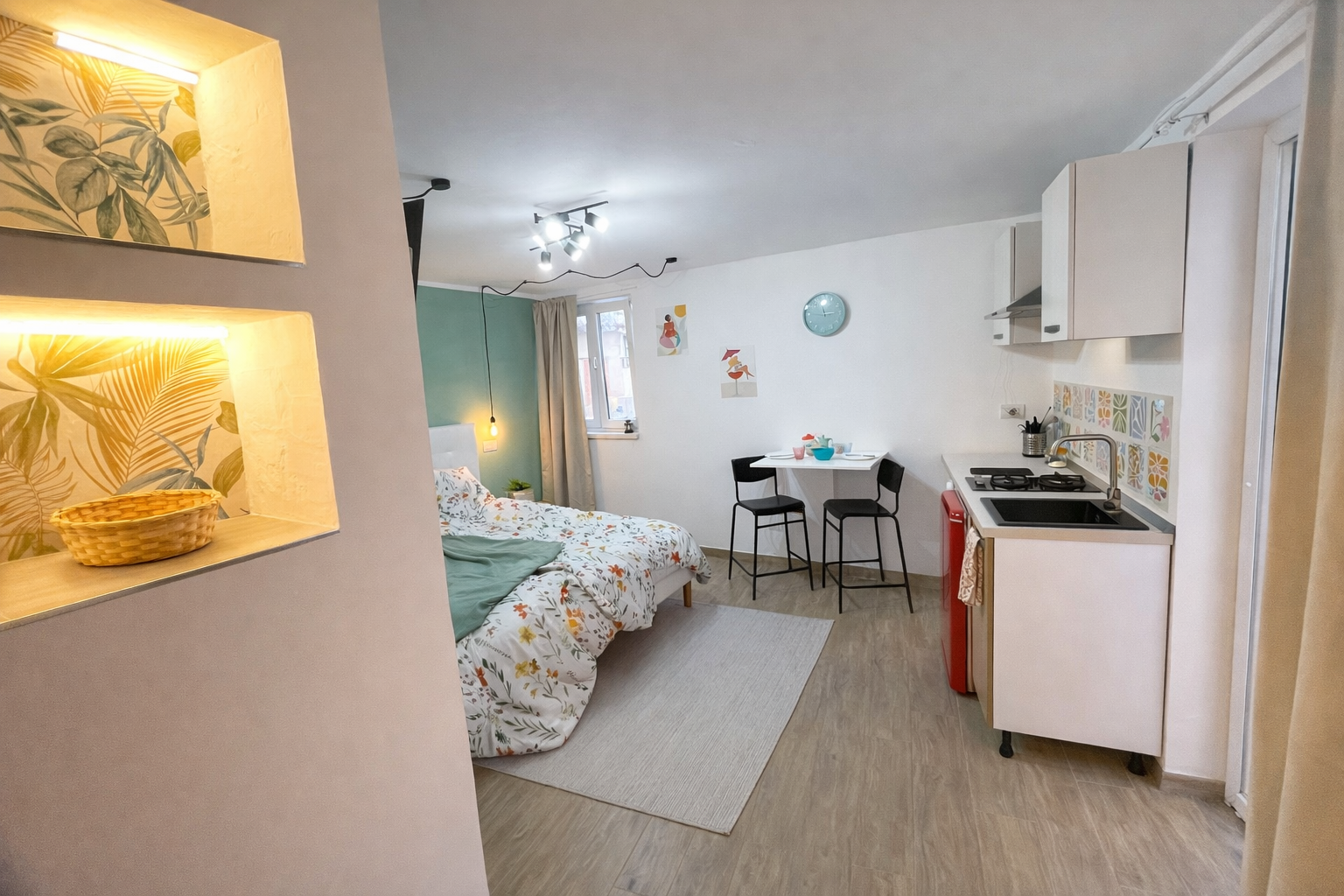 L'ambiente open space, accogliente e luminoso, ospita una cucina completamente attrezzata, una zona living con isola centrale, un comodo letto matrimoniale e un bagno privato con doccia.